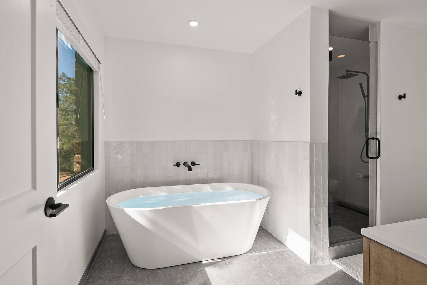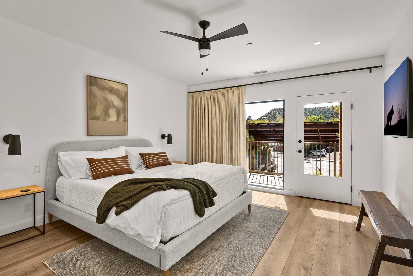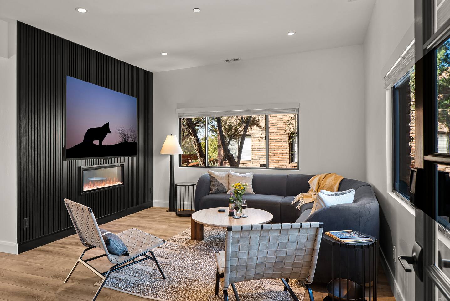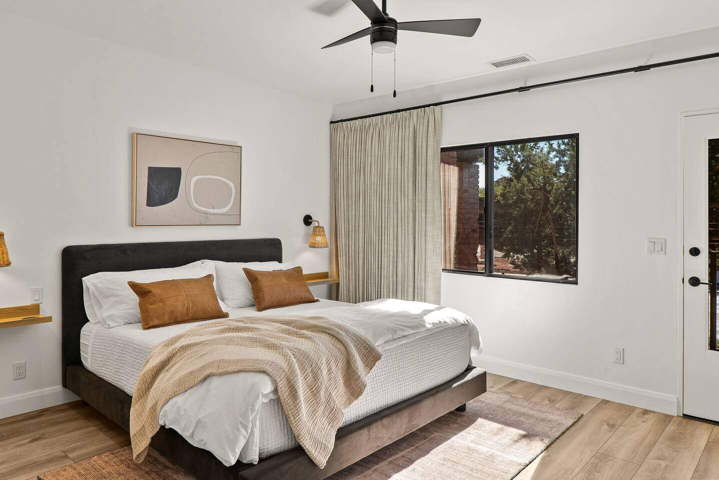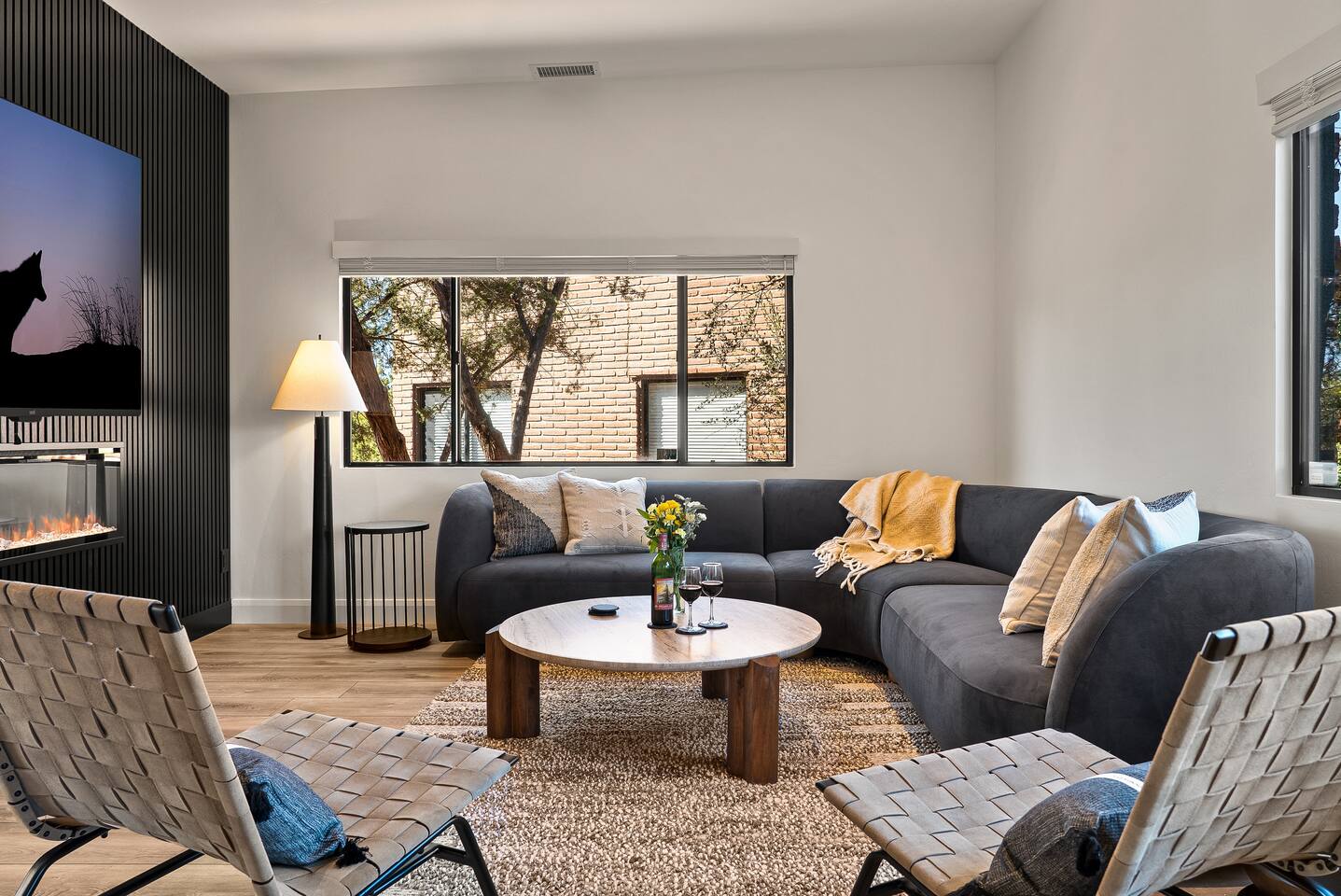 Summer Specials on last minute bookings. Coyote Den Villa is nestled in the heart of Sedona. The Villa offers the perfect blend of comfort, luxury and convenience. You’re just moments away from world-class hiking trails, vibrant shops, art galleries, and eateries. Featuring two spacious bedrooms, each with its own ensuite bathroom, a fully equipped kitchen. Patio with a hot tub and BBQ grill where you can relax under the stars. Rear balcony with access to fenced seating and fire feature.