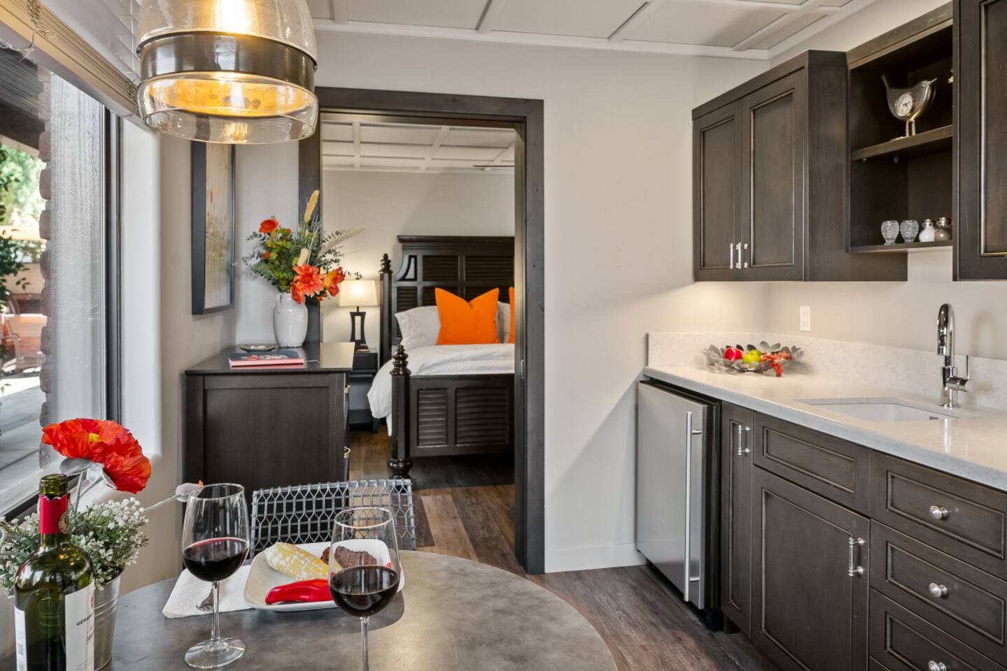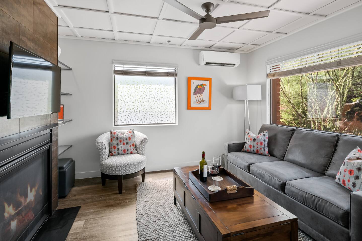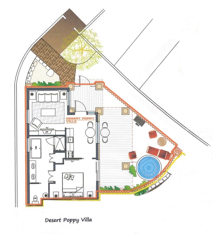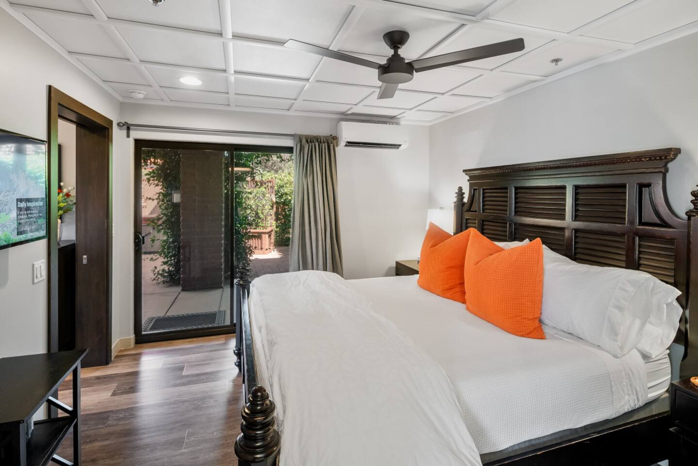 Desert Poppy Villa…a dreamy getaway for two... This villa offers an intimate experience with its own private patio and spa. Professionally decorated and beautifully appointed, the villa has more than 620 square feet of living space with one-bedroom, large bath, living with fireplace, two TVs, indoor and outdoor dining area and a private entrance. Complimentary covered parking allows for ease of access to your accommodation. Desert Poppy Villa is located in the heart of Sedona within walking distance to restaurants, shops, National Forest hiking trails, theaters, gourmet grocery stores, and many scenic destinations. There is an adjacent villa, the “Honeysuckle” which is also available. The villa is designed with your comfort in mind. For instance, enjoy a Sedona sunrise with a cup of gourmet coffee prepared in your K-cup coffee brewer while surfing the net for the day’s activities. Take a short drive to the many wonderful Sedona attractions. Visit the Chapel of the Holy Cross or hike one of our numerous National Forest trails. Visit a Stupa and take a yoga class. Just a short drive away, you can experience the wonders of Oak Creek Canyon, designated as a national scenic drive. While in Oak Creek Canyon visit Slide Rock and hike the famous West Fork Trail. The welcome notebook will provide a plethora of choices for you to experience while visiting Sedona and the surrounding areas. A scenic two hour drive will take you to the Grand Canyon, one of the seven natural wonders of the world. Upon returning to your home away from home, check out your kitchenette. You will find ample space to prepare a sumptuous dinner cooked out on your very own barbeque grill just steps away on your private patio. Take a short stroll from your villa and you will find several organic grocery stores where you can stock up on your favorite munchies or maybe the evening’s dinner and breakfast supplies. Perhaps a glass of wine is in order as you enjoy the mild evening temperatures. Relax on your private outdoor patio while viewing Sedona’s starry nights, a wonder to behold. To round out your villa experience, the custom bathroom will surely make you feel pampered with its large spa like floor plan. Your bathroom features include custom cabinets, fluffy bath towels, robes, romantic decorative lighting, quartz counter tops, large rain shower head and a free standing soaking bathtub for two. When the day comes to a close relax in the comfortable seating area and enjoy a romantic fire in your custom fireplace. On your flat screen television, watch your favorite television show or movie. Enjoy a restful night’s sleep on your memory gel mattress while the luxurious bed linens wrap you in comfort. Room darkening blinds make it easy to sleep-in, or you may want to rise with the sun and start another adventure in Sedona’s Red Rock Country! The sky is the limit and we look forward to welcoming you to the Desert Poppy Villa where we hope you will take home some unforgettable memories. Amenities: Custom designed gas fireplace Designer California King Bed with memory gel mattress Luxurious Bedding Custom cabinets with quartz counter tops Custom built furniture and wool area rug Bath products provided Hair dryer Fluffy high quality bath towels and outdoor spa towels Large spa feeling bathroom with deep-soaking free standing tub for two Custom shower with rain and wand shower heads (2) HD flat screen TV, Free Wi-Fi Complimentary covered parking Under countertop Refrigerator with ice maker, microwave, toaster, K-cup coffee brewer with coffee and tea Outdoor patio with Spa, barbeque grill and dinning area Room darkening window coverings Iron & ironing board His and her Bath Robes Self-controlled heating and cooling Separate Bathroom heating Closet with walnut hangers Books and games On site laundry facilities Patio lounge and dining seating