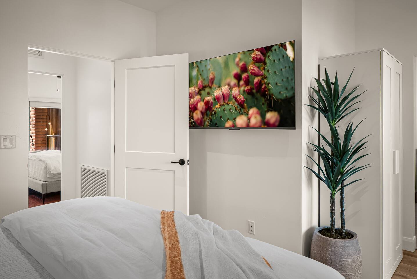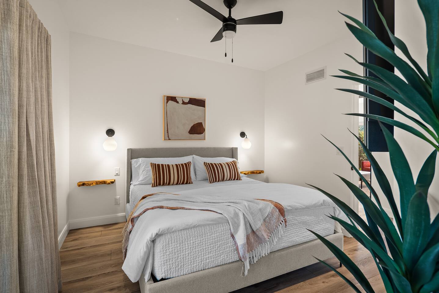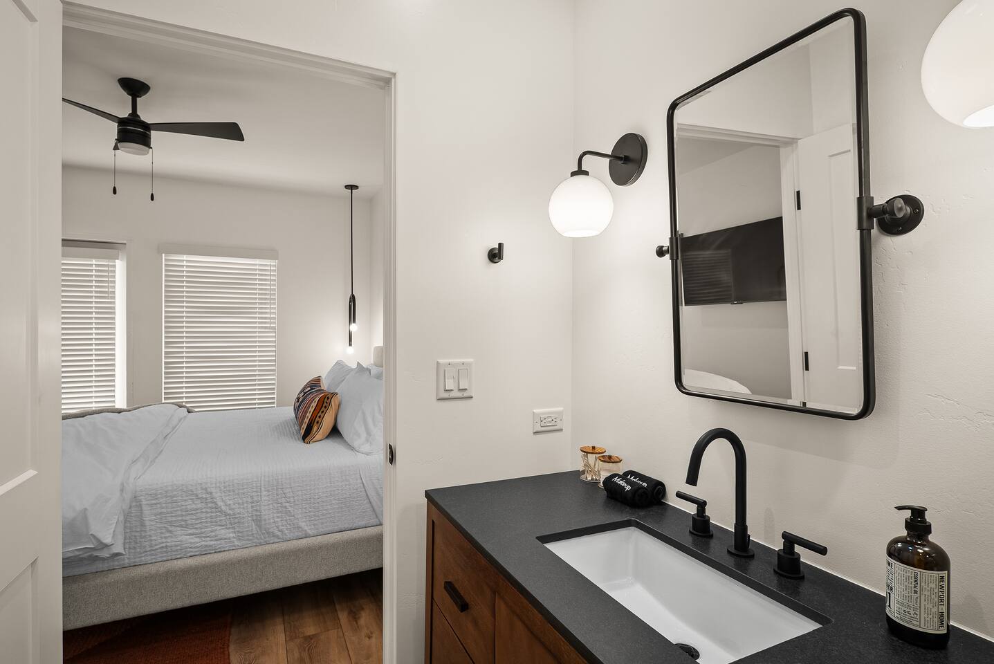 Prickly Pear Villa is family friendly with two bedrooms. It features two spacious ensuite baths, one of which includes a soaking tub for ultimate relaxation. The full kitchen is fully equipped for preparing meals, and the dining area comfortably seats four. Step outside to enjoy your own private patio with hot tub, ideal for outdoor dining or simply unwinding in the fresh air.