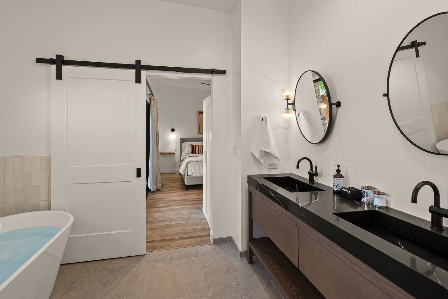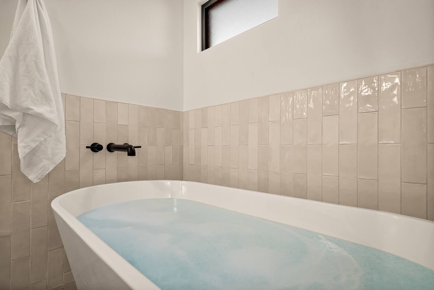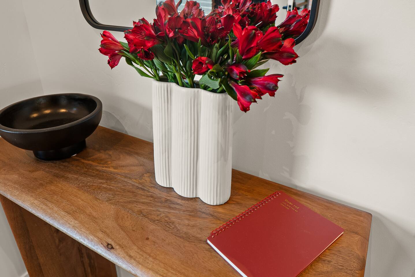 Prickly Pear Villa is family friendly with two bedrooms. It features two spacious ensuite baths, one of which includes a soaking tub for ultimate relaxation. The full kitchen is fully equipped for preparing meals, and the dining area comfortably seats four. Step outside to enjoy your own private patio with hot tub, ideal for outdoor dining or simply unwinding in the fresh air.